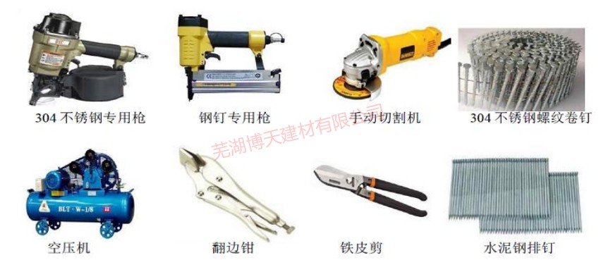 工具準備:304 不銹螺紋鋼釘專用搶、鋼排釘專用氣槍、手動切割機、304不銹鋼螺紋卷釘、空壓機、翻邊鉗子,鐵剪,水泥鋼排釘。